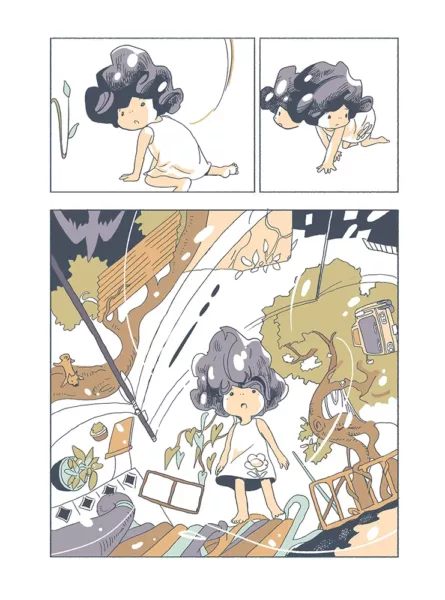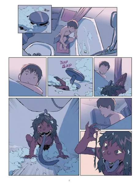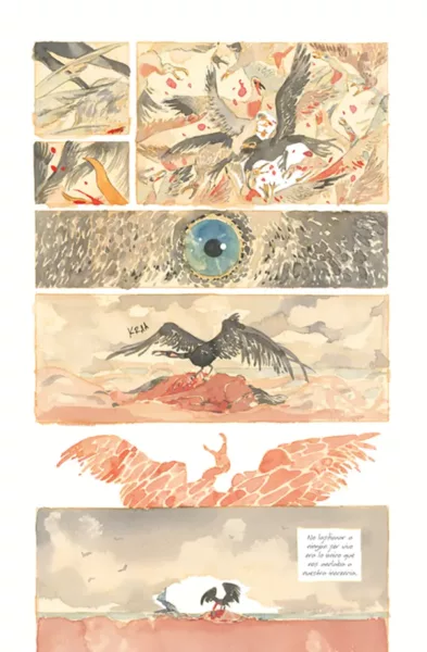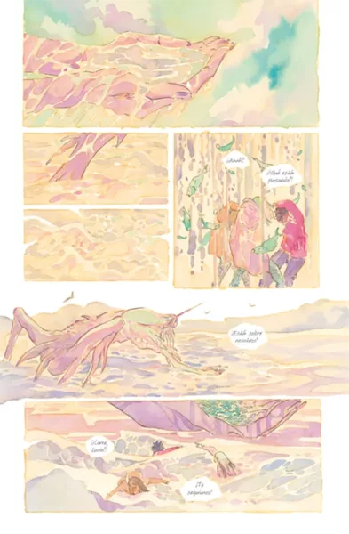 Emma Ríos 以精湛的水彩技法,在黎明與黃昏間變幻的色彩中,帶領讀者來到海邊,見證一個後末日生態恐怖故事。主角們的身體如同水彩畫中的光線般消融,逐漸失去人形,而唯有同情心才能在失去未來的社會中倖存下來。
